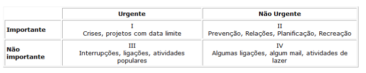 Considere o seguinte quadro, que toma en conta dois fatores: 1) Importância – que tão crítica é uma atividade para sua missão e seus valores, 2) Urgência – que tão insistentemente precisa da sua atenção.